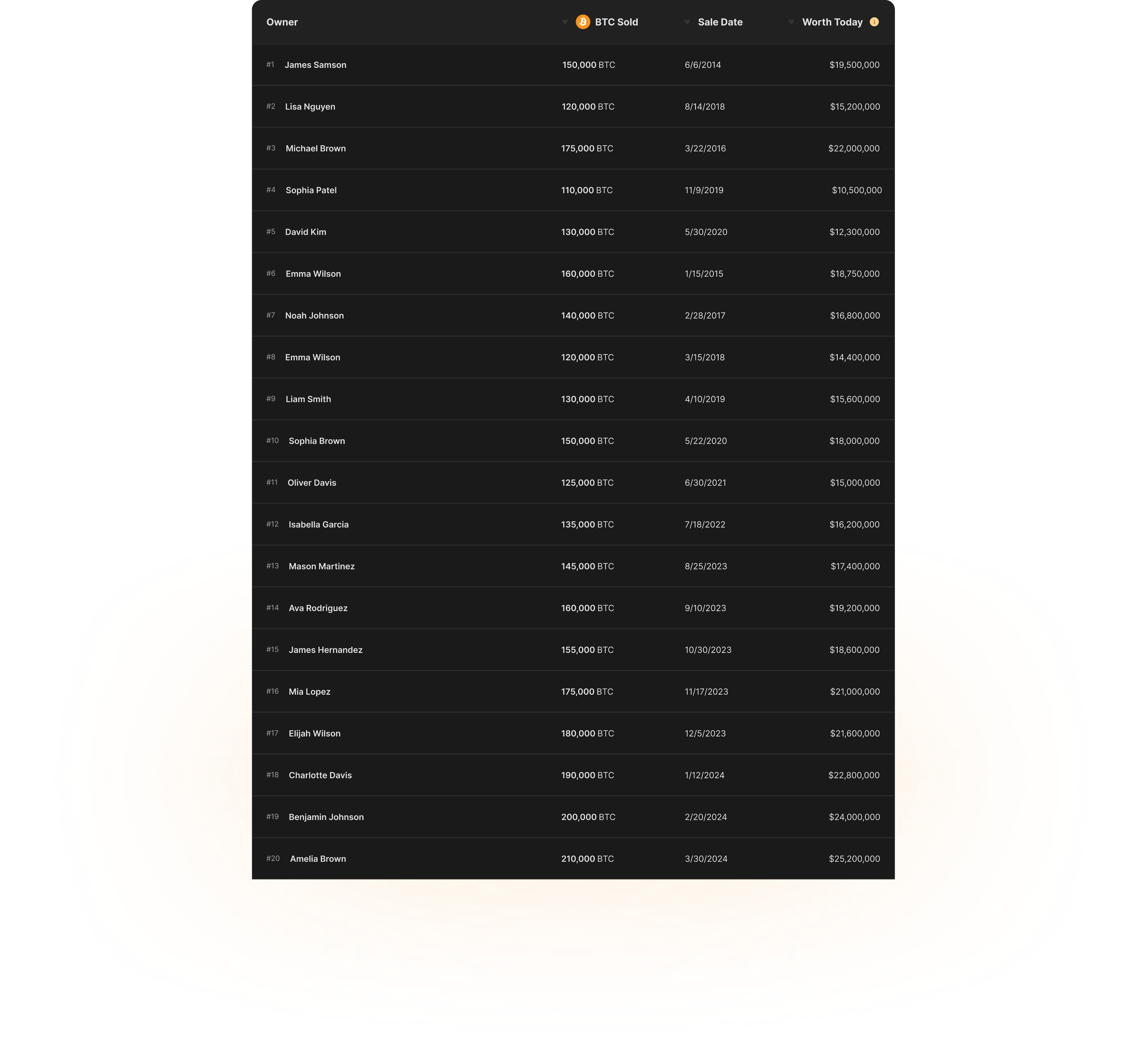 We list single sales ≥ 5 BTC or multiple sales totaling ≥ 10 BTC within a 30-day window.